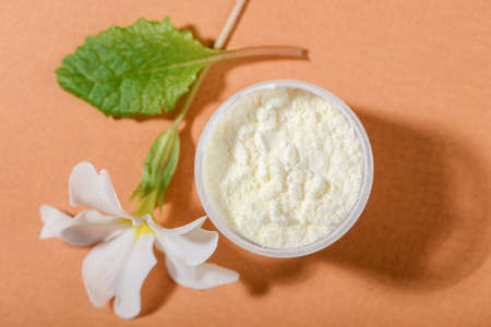 Dried Royal jelly powder on orange background. Close up. Top view.