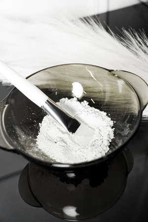 Kaolin clay white powder cosmetic grade for face mask and spa treatments. Black and white colors. Vertical photo