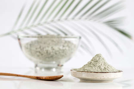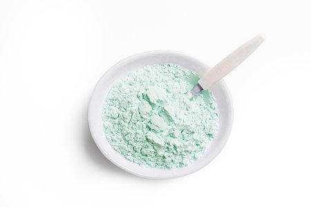 Natural green clay powder in bowl with spoon isolated on white background, design element. Alginate powder.