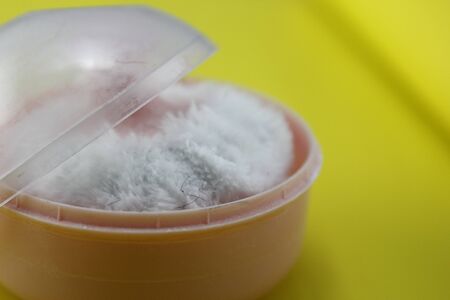Beige powder for make-up, pink. Beautiful beige powder for make-up on a pink flat lay. Concept for your design. Spring background.