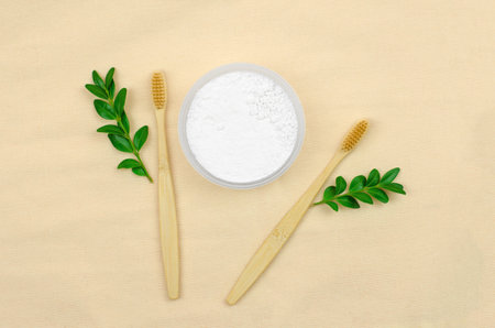 Bamboo toothbrushes and toothpowder on linen cloth with green leaves. Environmentally friendly personal hygiene products. Oral cavity care.