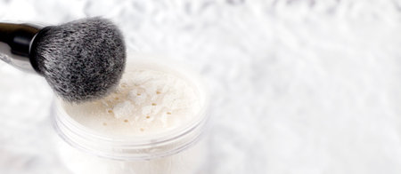 Top View of Scattered Face Powder and Makeup Brush on Textured Surface. Concept of Beauty Tools, Women's Cosmetics, and Makeup Essentials. Textured background. Copy space. Banner.