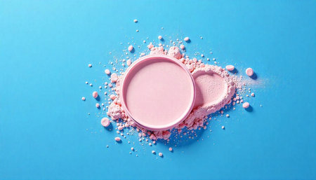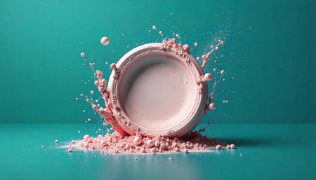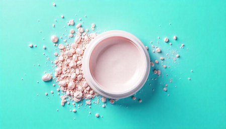 Clear white face powder with an empty circle on a soft pastel pink background, designed as a product placement backdrop for feminine beauty items.