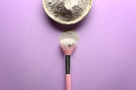 Close-up of a cosmetic dry white and green clay powder on gray background with mask brush
