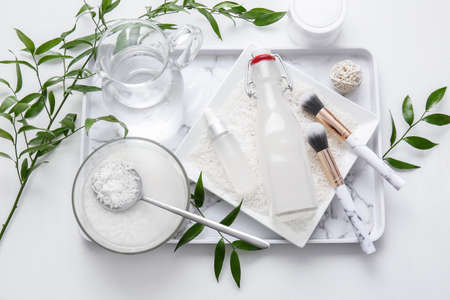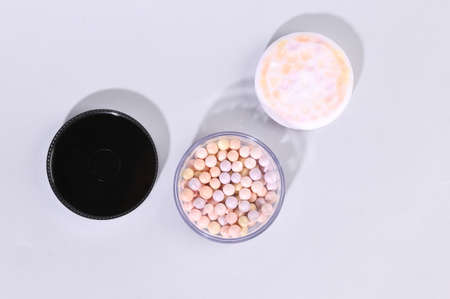 Close-up smear moisturizer and translucent loose powder on white background with copy space. Skin care concept, top view