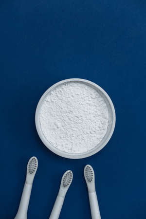 Toothbrushes with tooth powder on classic blue background. Color 2020