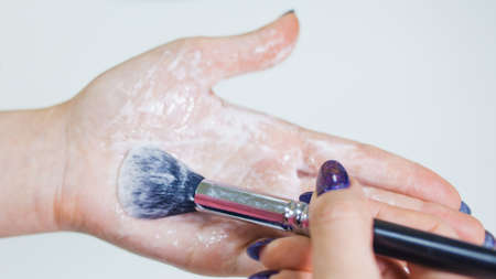 Pearl powder. Female hand applied by brush perly eyeshadow on hand