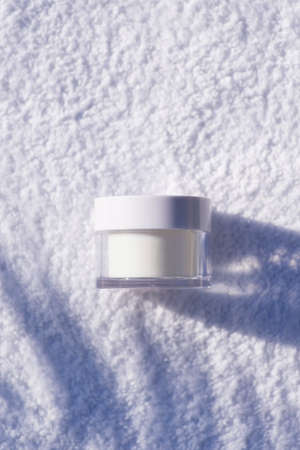 White glass jar against the background of a white towel. Skincare products , natural cosmetic with palm leaves shadow. Beauty concept for face body care