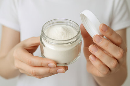 Close-up of a hand holding a jar of loose collagen powder. concept of beauty product, skincare container, cosmetic packaging.