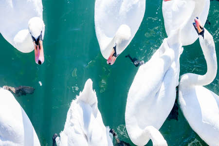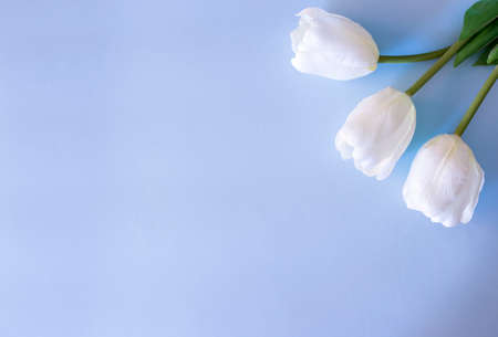 White tulips on a blue wooden background. View from above. Selective focus. Top view. Close-up, Copy space. Mothers and Women's day concept.