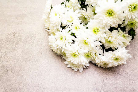 A bouquet of white chrysanthemums on a stone background. Flower Card Concept, copy space.
