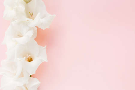 Beautiful white gladioluses on pink background. Pattern of gladioli with space for your text, holiday greeting card. Valentines. Flat lay, top view.