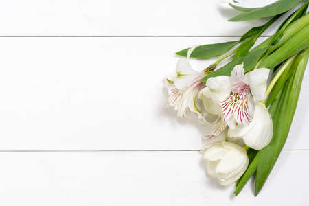 composition of white flowers on a white wooden background with copy space. holiday and congratulations concept