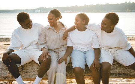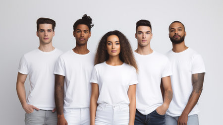 Two cheerful friends in white t-shirts stand side by side cropped view