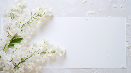 Blank paper and bouquet of white flowers. Mockup of greeting card. Top view with space for your text. Flat lay