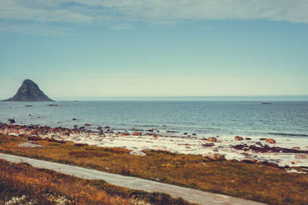 Seascape, sea coast with sandy beach and island Bleiksoya in the distance, resort Bleik Andoya Norway. Vesteralen archipelago.