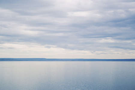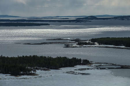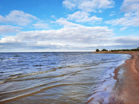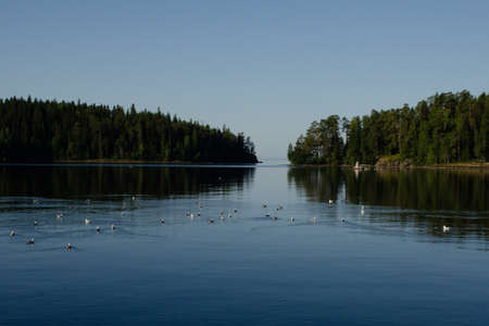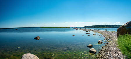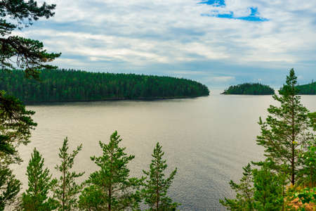 Landscape of blue lake deep in the light of the sun in the daytime, clouds in the sky Ladoga skerries Karelia
