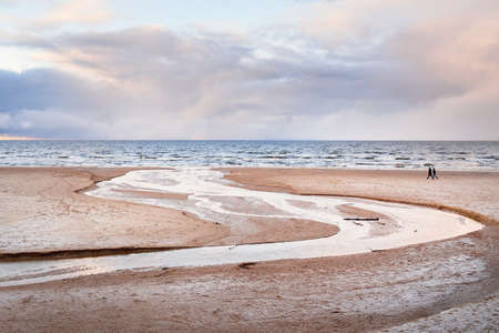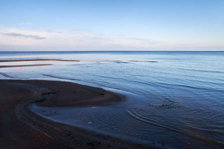 Panoramic view of the Baltic sea from a sandy shore. Clear sunset sky, colorful glowing pink clouds, soft light. Symmetry reflections on water, natural mirror. Weather, winter, climate change, nature