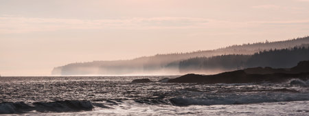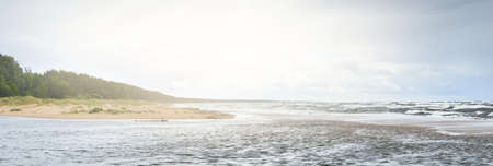 Panoramic view of th? gulf of Finland on Baltic Sea with pine forest on sand dunes during sunset. Typical Baltic landscape
