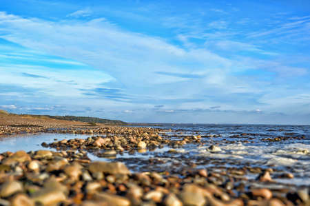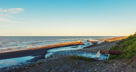 Beautiful sunrise on the shore of the White Sea with stones and seaweed at sunny morning Belomorsk, Karelia.