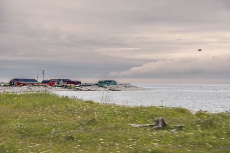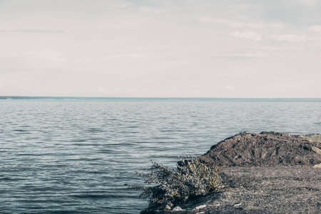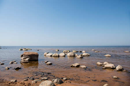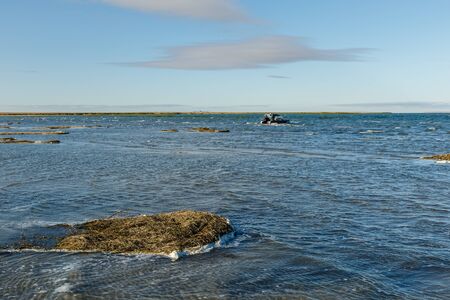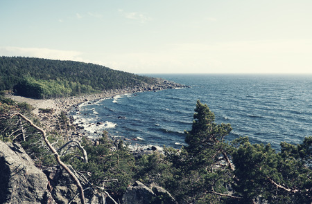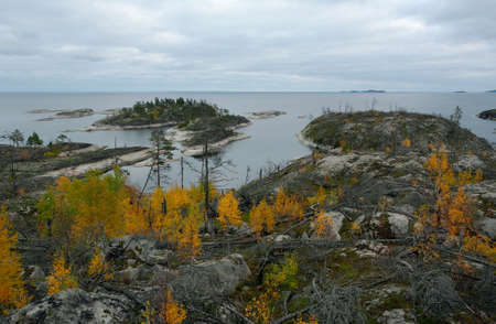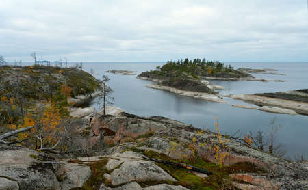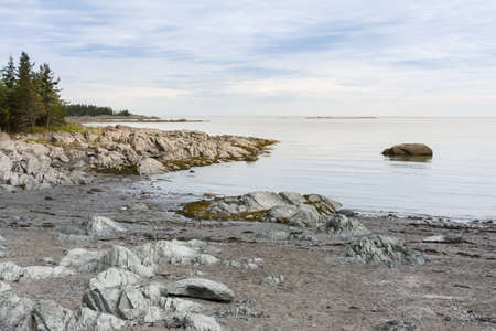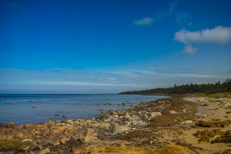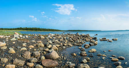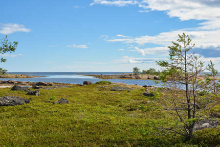 The rocky shore of the White Sea. Summer seascape in Karelia, in the north of Russia.