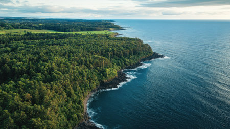 Aerial view of a forest bordering a coastline, with the ocean visible in the background, leaving space for text.