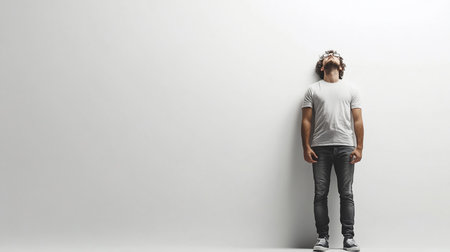A young man with a beard and headphones stands against a white wall, looking upwards with a thoughtful expression.