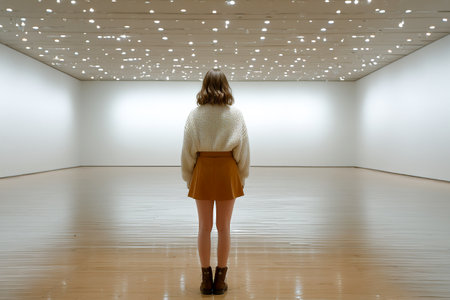 A viewer stands in a spacious modern gallery, captivated by a large monochrome landscape artwork. The scene evokes emotions of tranquility and contemplation.