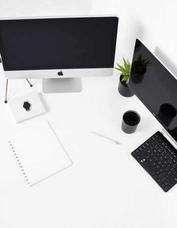 Minimalistic workplace with computer, keyboard, mouse, smartphone and plant on white table