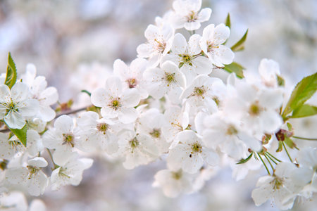 Cherry tree blossoming flowers with soft petals on natural floral background
