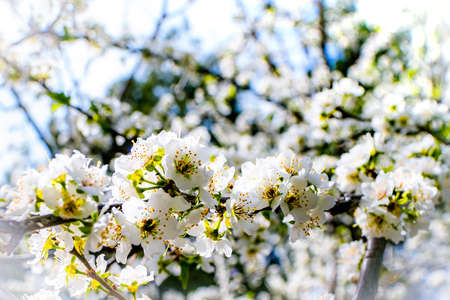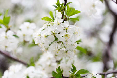 Blooming cherry branches with white flowers close-up, background of spring nature. Macro image of vegetation, close-up with depth of field.