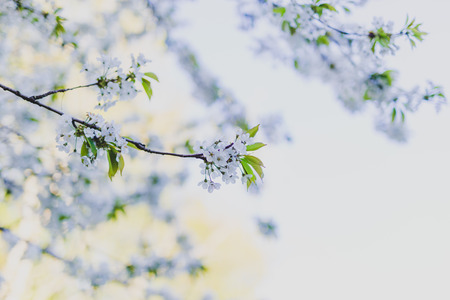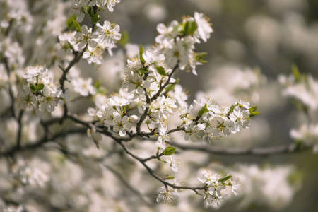 White flowers of the blooming spring tree branches, vintage color effect.