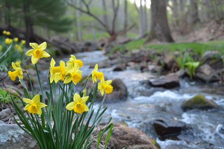 Yellow daffodils and a stream in the spring forest.