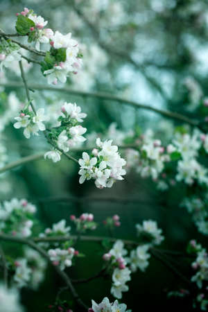 Delicate white Apple blossom in the spring garden. The focus is in the foreground, the background is out of focus. Spring flowers, spring background, flower background. Side view, space for text