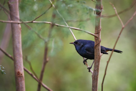 Tickell's blue flycatcher perched on a tree branch in a nicely blurred green background.