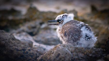White capped noddy chick contrasts soft and fluffy in harsh rocky landscape with beak open on Lady Elliot Island.