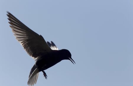 Silhouette photo of common tern flying under sunset sky. Sterna hirundo