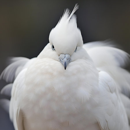 A close-up captures a white seabird, highlighting its sharp beak and piercing blue eyes. The bird's feathers display subtle texture and contrast against a soft, unfocused sky. This image, with its intimate perspective and natural lighting, would be appropriate for editorial and commercial applications.