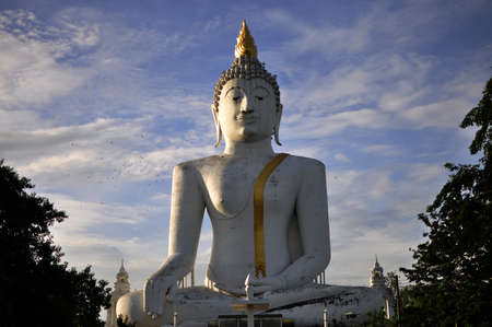 Looking up of big white Buddha statue on blue sky background in Wat Phai Rong Wua temple at Suphan Buri, Thailand, Religion concept, Space for text in template