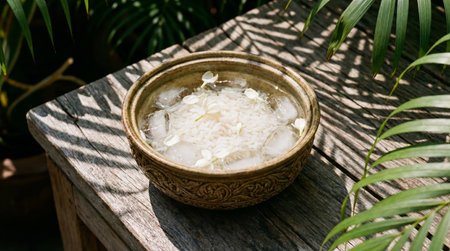 A ceramic bowl holds traditional Thai Khao Chae, a refreshing rice dish with jasmine-scented water, ice, and floating jasmine flowers.