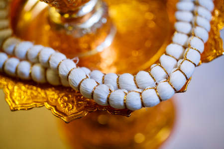 Flower garlands on a gold tray in tradition Thai wedding ceremony day. Jasmine garland.