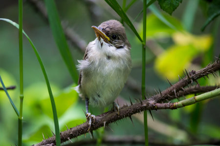 a gray warbler chick on a branch. colorful wildlife photo. close-up. warbler.; white-throat warbler. Curruca communis. Sylviidae.