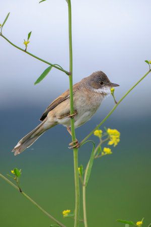 Closeup of a Whitethroat bird, Sylvia communis, displays in yellow flowers