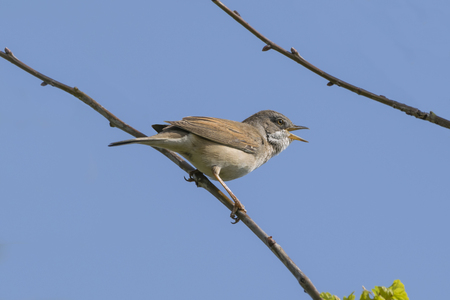 A Whitethroat bird, Sylvia communis, singing to attract a female during breeding season in Springtime