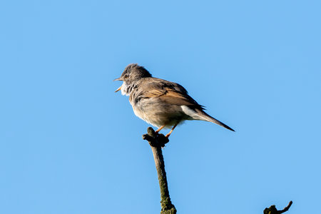 Common Whitethroat (Sylvia communis) perched at the top of a tree in the summer sunshine