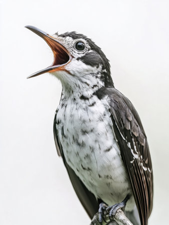A cuckoo bird calls loudly, its beak wide and feathers displayed, strikingly contrasting the white daylight background.