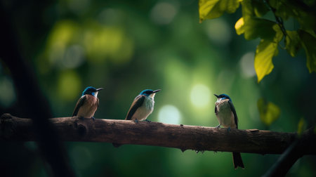 This photograph captures a couple of tiny birds perched on a tree branch. The soft, blurred background creates a dreamy effect, emphasizing the delicate beauty of the birds, Ai Gennerated