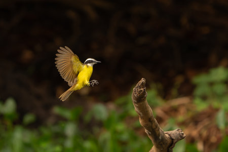 Great kiskadee in flight arriving and landing on old stump by the Black River the Pantanal Brazil.