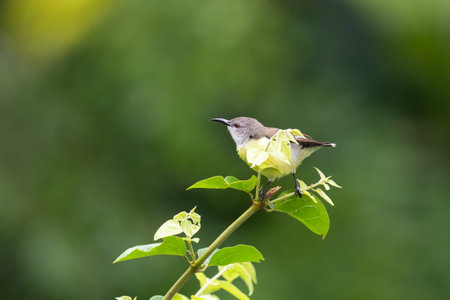 Female Purple-rumped sunbird (Leptocoma zeylonica), perched atop a plant in the garden in Mangalore, India.