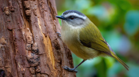 A vibrant bird with green and gray feathers is climbing the textured bark of a tree. Sunlight filters through the leaves creating a serene atmosphere in the forest.